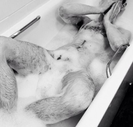 Hy glimlag as hy sy onbesnede, dik penis ook bo die water sien lê by sy bekken soos ‘n uitgespoelde stuk dryfhout op ‘n eilandjie. Hy neem dit in sy een hand en laat rus sy hoof op die agterrand van die bad en maak sy oë toe. Die badsout prikkel, tintelend, in sy bene, boude en rug op van onder af asof hy sy eie aromaterapie toepas. Hy begin sy penis op en af stimuleer en voel dit groei in sy hand.